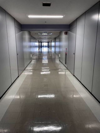 オフィス階には直線の長い廊下があり、その両サイドに広いオフィスフロアがあります。